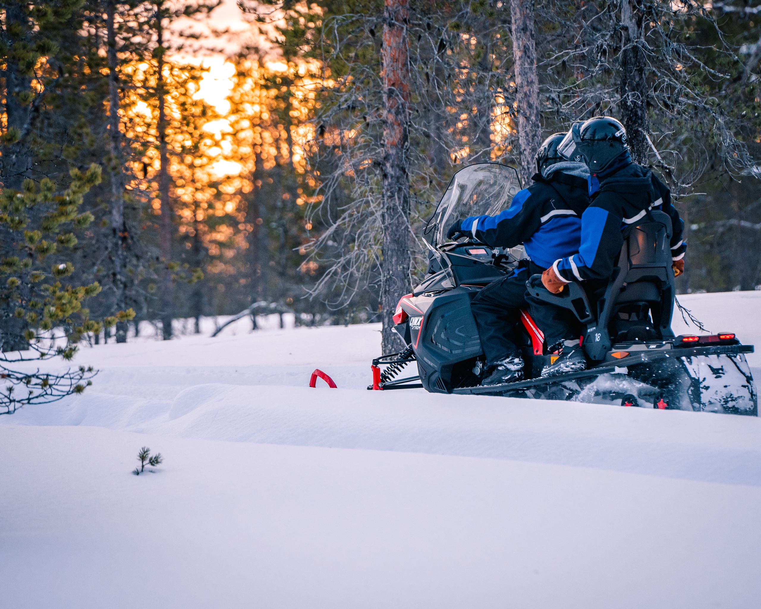 A shared snowmovile for 2 persons (possibility to book a solo snowmobile for extra supplement), helmets, snowmobile lesson, english-speaking guide